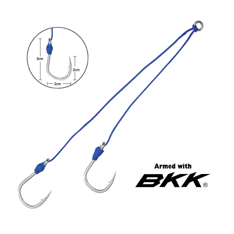The Jatsui Crazy Squid Assist Hooks are specially designed for Jatsui Crazy Squid lures, enhancing their effectiveness in catching predatory saltwater fish. Each set features two sharp, reinforced BKK hooks (size 2/0), connected with durable blue assist cord, providing maximum hook-up potential and reliability.